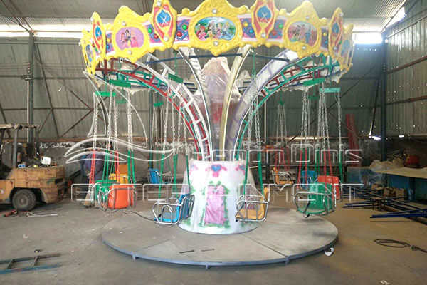 The height of the mini flying chair rides is 3.7 meter. It has rather cute and small footprint. The chair is kid size seat and hang over the ground by reasonable centimeter for kids to sit. The mini flying chair rides cover 4.5 meter. Large luxury flying chair fly in the high air and the height of the chair might be scaring for small kids. Yet, this indoor mini flying chair ride can offer kids the flying riding experience with less dizzy spells that riders feel. It is suitable for business owners to buy for indoor use. One flying chair can carry 8/ 16 kids at one time. We can customize the seat for you according your needs for flying chair ride.